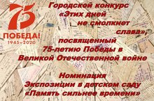 Творческий коллектив нашего детского сада приняли активное участие в городском конкурсе «Этих дней не смолкнет слава», посвященный 75-летию Победы в Великой Отечественной войне в номинации - Экспозиции в детском саду «Память сильнее времени». Своими руками педагоги и родители создали очень красивую экспозицию и наполнили ее богатым дидактическим материалом, играми, пособиями и игрушками, благодаря которым в памяти наших воспитанников остаются знания о Великой Отечественной войне 1941 -1945 годов.