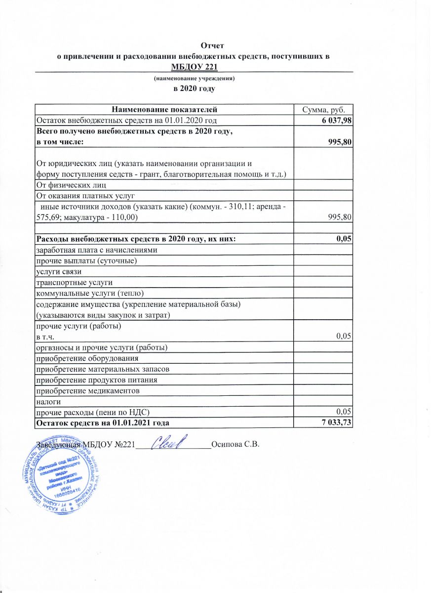 Отчет о привлечении и расходовании внебюджетных средств, поступивших в МБДОУ №221 в 2020 г
