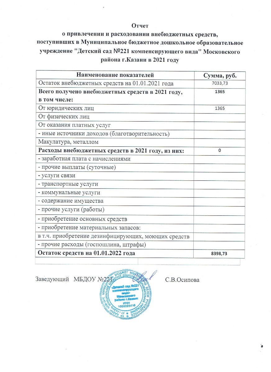 Отчет о привлечении и расходовании внебюджетных средств, поступивших в МБДОУ №221 в 2021 г.