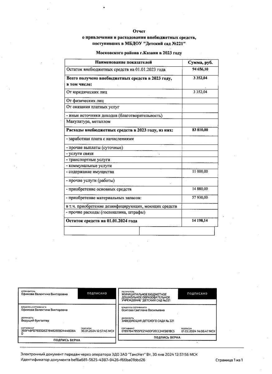 Отчет о привлечении и расходовании внебюджетных средств, поступивших в МБДОУ №221 в 2023 г