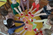 Целью которой была продолжать знакомить детей с нравственными ценностями, в частности: добротой, душевной щедростью, милосердием, толерантностью, заботой о старшем поколении и о сверстниках с ограниченными возможностями, ответственностью в молодежной среде, а так же обсуждение и воплощение конкретных добрых дел. Ребята выполнили аппликацию, в которой поделились своим «добром» (ладонью и сердцем)с другими людьми. -