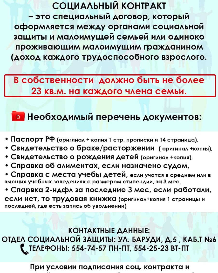 Социальный контракт - это специальный договор, который оформляется между органами социальной защиты и малоимущущей семьей или одиноко проживающим малоимущим гражданином.