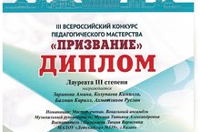 За участие в III Всероссийком конкурсе педагогического мастерства "Призвание" награждены дипломом лауреата III степени воспитанники МАДОУ Зарипова Амина, Колупаева Камилла, Балмин Кирилл, Ахметзянов Руслан, музыкальный руководитель Мусина Татьяна Александровна, воспитатель Низамиева Люция Варисовна.