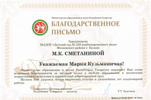 Заведующему МАДОУ "Детский сад № 339" Сметаниной М.К. вручено Благодарственное письмо Министерства образования и науки Республики Татарстан за весомый вклад в систему образования и воспитания подрастающего поколения и многолетний добросовестный труд.