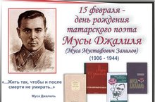 15 февраля 2021 года исполняется 115 лет со дня рождения татарского поэта-героя Мусы Джалиля. На его стихах, проникнутых гуманизмом и мужеством, было воспитано ни одно поколение. Поэзия Мусы Джалиля, одухотворённая высокими человеческими идеалами и наполненная горячей любовью к людям, нашла дорогу к миллионам сердец. Поэта знают и почитают не только на родине, но и в Европе, Америке и Азии. Стихи Джалиля, переведенные на десятки языков, облетели весь мир. Ему первому среди поэтов нашей страны была присуждена Ленинская премия 1957 года за цикл стихотворений «Моабитская тетрадь». Он был посмертно удостоен звания героя Советского Союза.