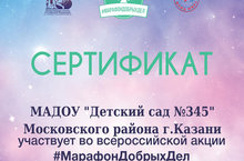 Наш Детский сад получил СЕРТИФИКАТ участника всероссийской акции Марафона "Добрых дел"! Спасибо всем кто активно учавствует в выполнении заданий!! Нам есть к чему стремиться... Продолжаем выполнять задания и помогать сохранять природу!!
