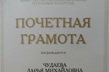 Тәрбиячебез Чудаева Дарья Михаил кызы мәктәпкәчә яшьтәге балалар тәрбияләү өлкәсендә күпъеллык тырыш, фидакарь хезмәте өченТатарстан җөмһүриятенең мактау грамотасына лаек булды.Балалар бакчасы коллективы һәм әти-әниләр исеменнән чын күңелебездән тәбрик итәбез. Иҗади уңышлар телибез!
