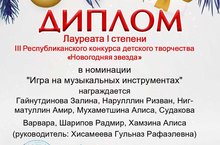 Поздравляем воспитанников, подготовительной группы, с победой на Республиканском конкурсе детского творчества "Новогодняя звезда", в номинации "Игра на музыкальных инструментах". Руководитель: Хисамеева Гульназ Рафаэлевна.