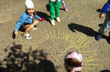 Сегодня в первый день лета и ко Дню защиты детей, у нас было организованно развлечение "Подарим детям улыбку". Дети в радостной, праздничной, доброжелательной атмосфере пели, играли, танцевали и рисовали на асфальте.