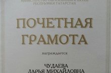 Воспитатель Чудаева Дарья Михайловна за весомый вклад в воспитание и обучение детей дошкольного возраста и многолетний плодотворный труд была удостоена Почетной грамотой Министерства образования и науки Республики Татарстан. От всей души поздравляем и желаем дальнейших творческих успехов!