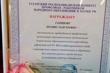 Почетной Грамотой рескома Профсоюза награждена председатель профкома, воспитатель Гарипова Лилия Талгатовна за активную работу в Профсоюзе. Творчество, креативность, юмор, умение сплотить и повести за собой – все Ваши таланты как профсоюзного лидера, а главное высокие человеческие качества: доброжелательность, взаимопонимание, поддержка, уважение...Желаем дальнейших успехов и побед!!!
