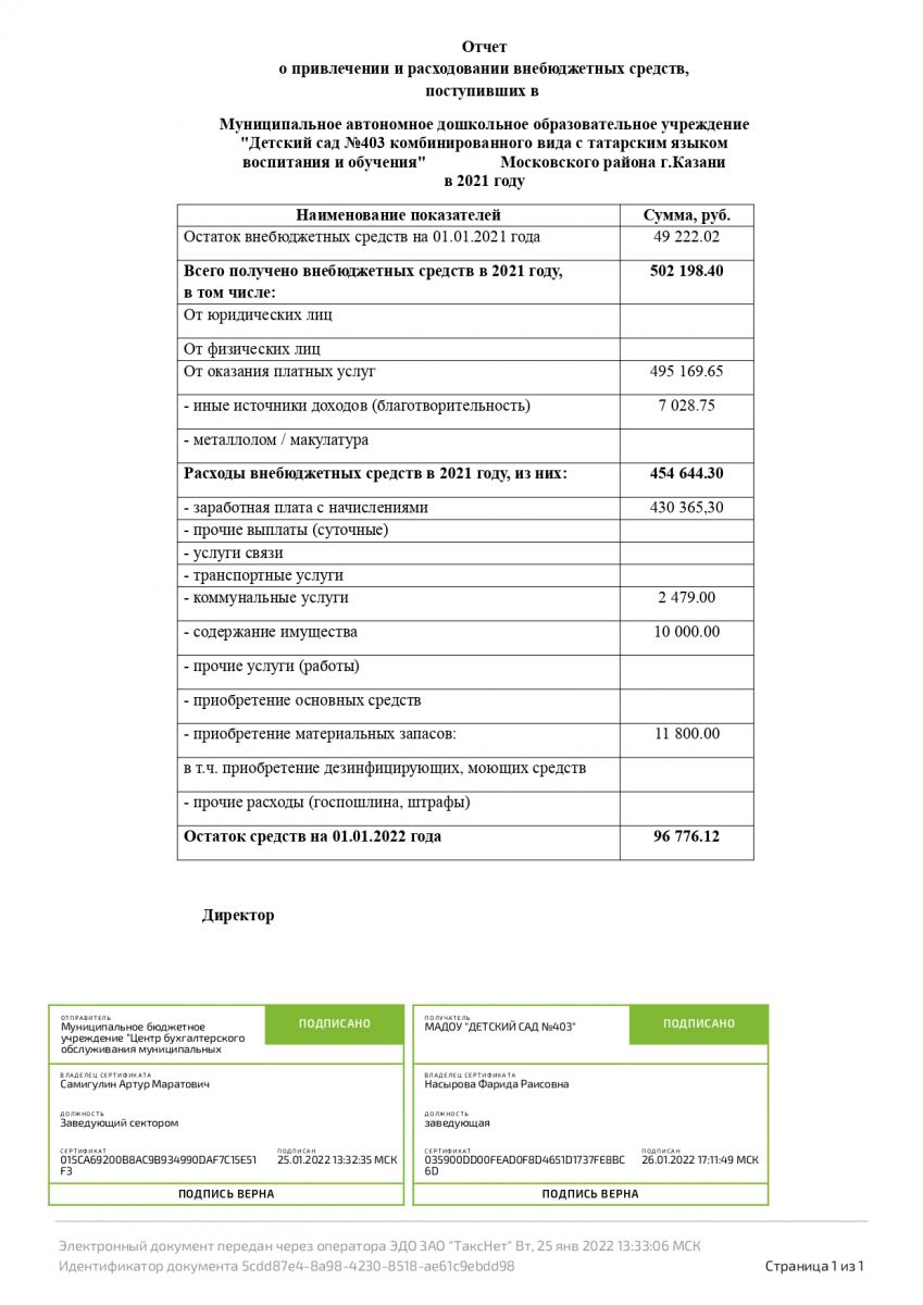 Отчет о привлечении и расходовании внебюджетных средств в МАДОУ № 403 за 2021 год