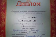 Поздравляем ученика 7 класса МБОУ "Гимназия №94" Идиатуллина Ильназа с почетным вторым местом в городской научно-исследовательской конференции школьников им.К.Д.Ушинского.