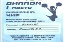 24.04.16 г. юная команда гимназии по черлидингу М-kids 75 в чемпионате и первенстве республики Татарстан по этому оригинальному художественно – спортивному виду спорта одержали блестящую победу!!! Тренер – Королёва Анастасия Владимировна.