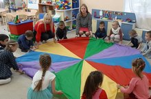 Плавно начинаем учебный год. После лета у ребят очень много впечатлений, дети с новыми силами и с большим желанием стремятся получить новые умения и знания. С нового учебного года свои двери распахнула для дошкольников старшая логопедическая группа. Для сплочения детского коллектива, а также решения ряда образовательных задач педагогам приходит на помощь игровое пособие "Парашют". Развиваемся и учимся играя.