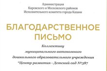 По итогам 2016 года коллектив МАДОУ "Центр развития ребенка - детский сад №387" за высокую результативность в профессиональных конкурсах, активную, плодотворную работу и большой вклад в развитие системы дошкольного образования Кировского и Московского районов города Казани награжден Благодарственным письмом Администрации Кировского и Московского районов Исполнительного комитета города Казани за подписью Главы администрации С.А. Миронова