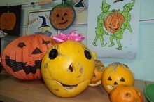 В нашей "Золотой рыбке" все детишки знакомятся с английским языком. Сегодня весь детский сад играл в Хэллоуин - было весело: мы прогоняли и пугали свои капризульки, неумейки и нехочушки...В каждой группе появились поделки из тыквы...