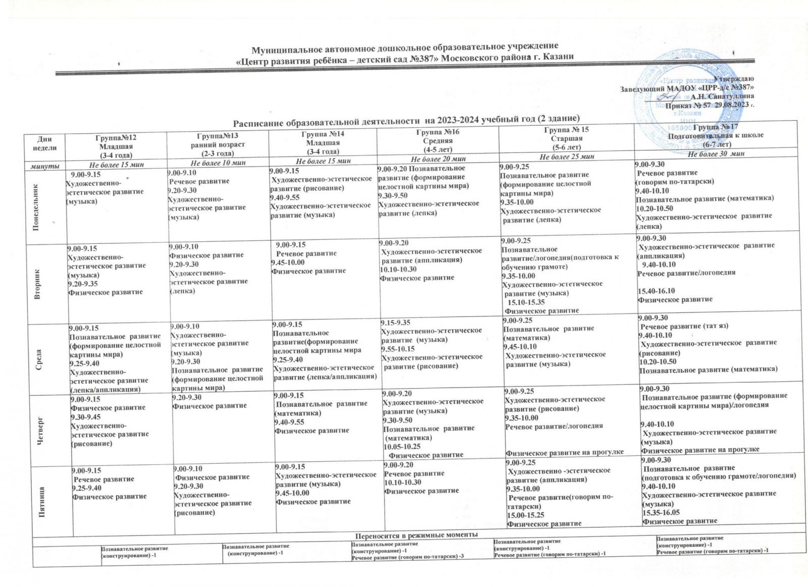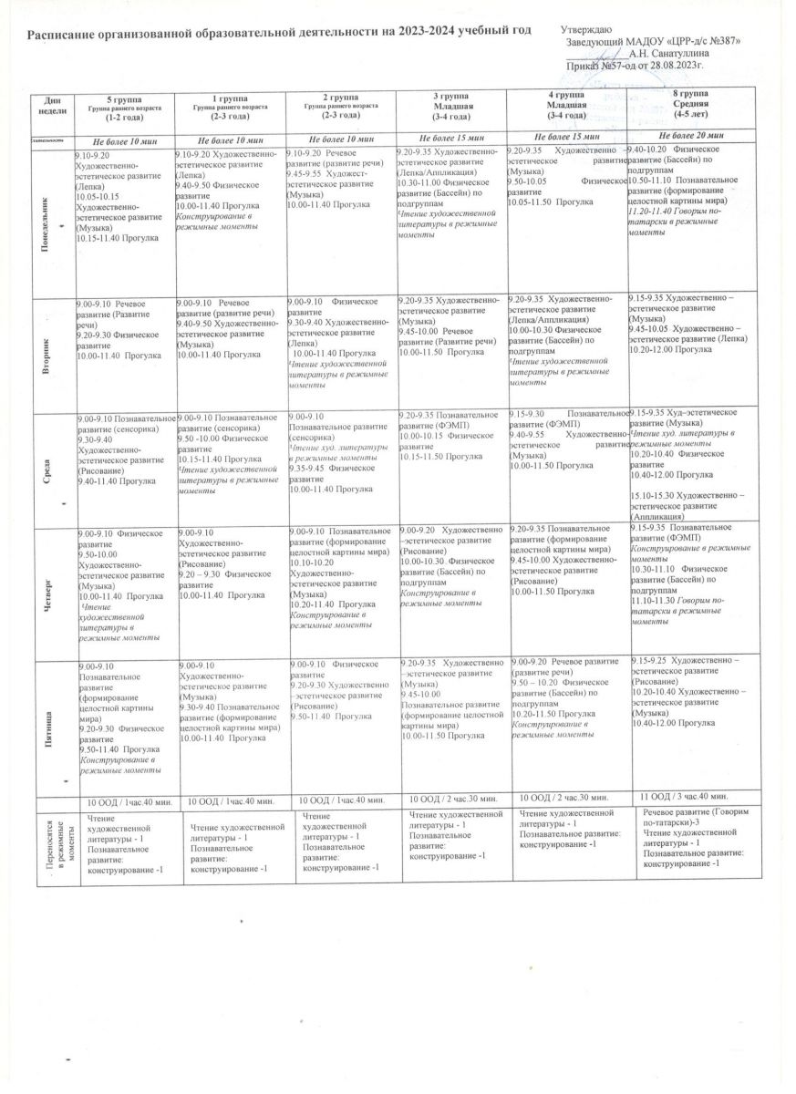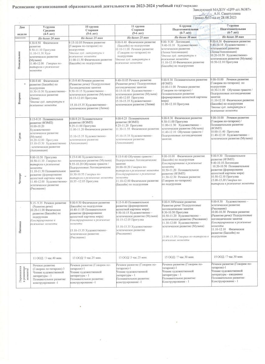 Расписание образовательной деятельности на 2023-2024 уч год Батыршина 21а