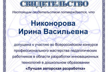 Учитель-логопед Никонорова Ирина Васильевна принимает участие во Всероссийском конкурсе профессионального мастерства педагогических работников в области разработки инновационных технологий в дошкольном образовании "Лучшая авторская разработка". Итоги конкурса будут известны 15 февраля 2016 года. Желаем победы и творческих успехов!