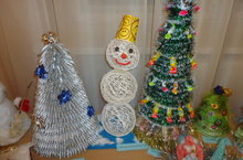 В детском саду работает выставка поделок "Мастерская Деда Мороза". Родители с детьми изготовили много елочек и снеговиков из различного материала.