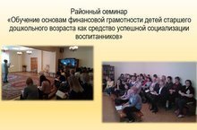 Педагоги МАДОУ "Детский сад N 97" приняли участие в районном семинаре "Обучение основам финансовой грамотности детей старшего дошкольного возраста как средство успешной социализации воспитанников", организованном на базе МАДОУ "Детский сад N 207". Воспитатель Сафина Э.Ф. представила мастер-класс НОД "Играем в экономику: потребности и бюджет семьи", проведенный воспитателями Фурсовой Е.А., Сафиной Э.Ф. с воспитанниками подготовительной к школе группы. Старший воспитатель Милявская И.Г. подготовила стендовый доклад. "Финансовая грамотность для старших дошкольников через игровое взаимодействие в ДОУ". Работа семинара была эффективной, педагоги получили полезную информацию о методах и организации системы работы по повышению финансовой грамотности у старших дошкольников в ДОУ.
