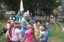 24 июля дети путешествовали в космическом пространстве вместе с ведущей развлечения воспитателем Зиганшиной Г.Г., Лунатиком и Звездочетом (роли которых исполнили воспитатели Сафиуллина А. А., Гамирова Э.Х.). Космическое путешествие получилось интересным и занимательным. Ребята обобщили свои знания о космосе, полученные в течение года и летней тематической недели. Дети занимались подготовкой в космонавты в игре: "Наш дружный экипаж", исполнили танец "Я-ракета", спасли Луну и Лунатика, отгадав сложные загадки пришельцев. Звездочету помогли навести порядок на орбите, играя в музыкальную игру: "Парад планет". Соревновались в умении испытывать невесомость (стоя на одной ноге) в открытом космосе и исследовали неизвестную планету (прыгая с островка на островок). Всем было весело!
