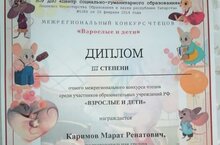 Воспитанник подготовительной к школе логопедической группы №5 Каримов Марат успешно выступил на межрегиональном конкурсе чтецов "Взрослые и дети". Поздравляем!!!