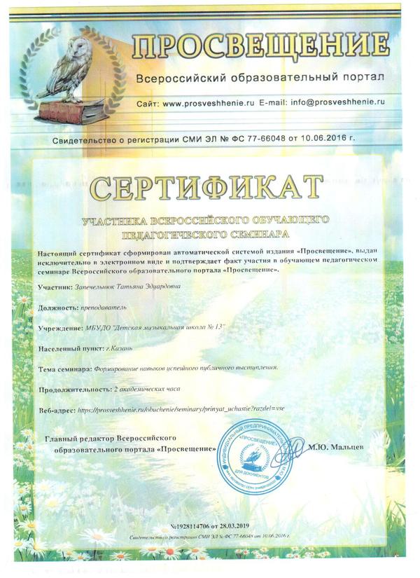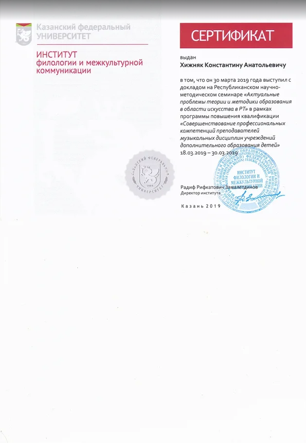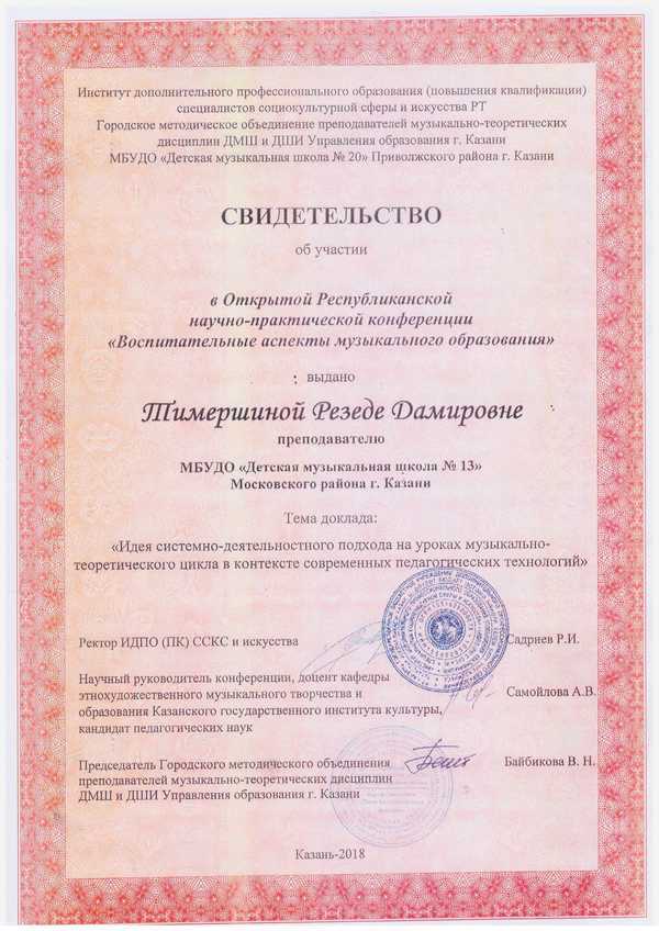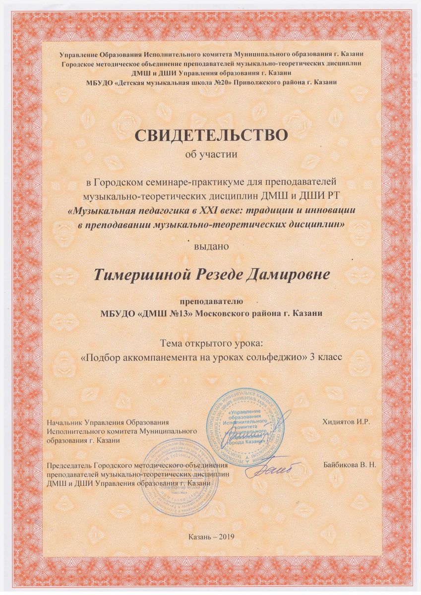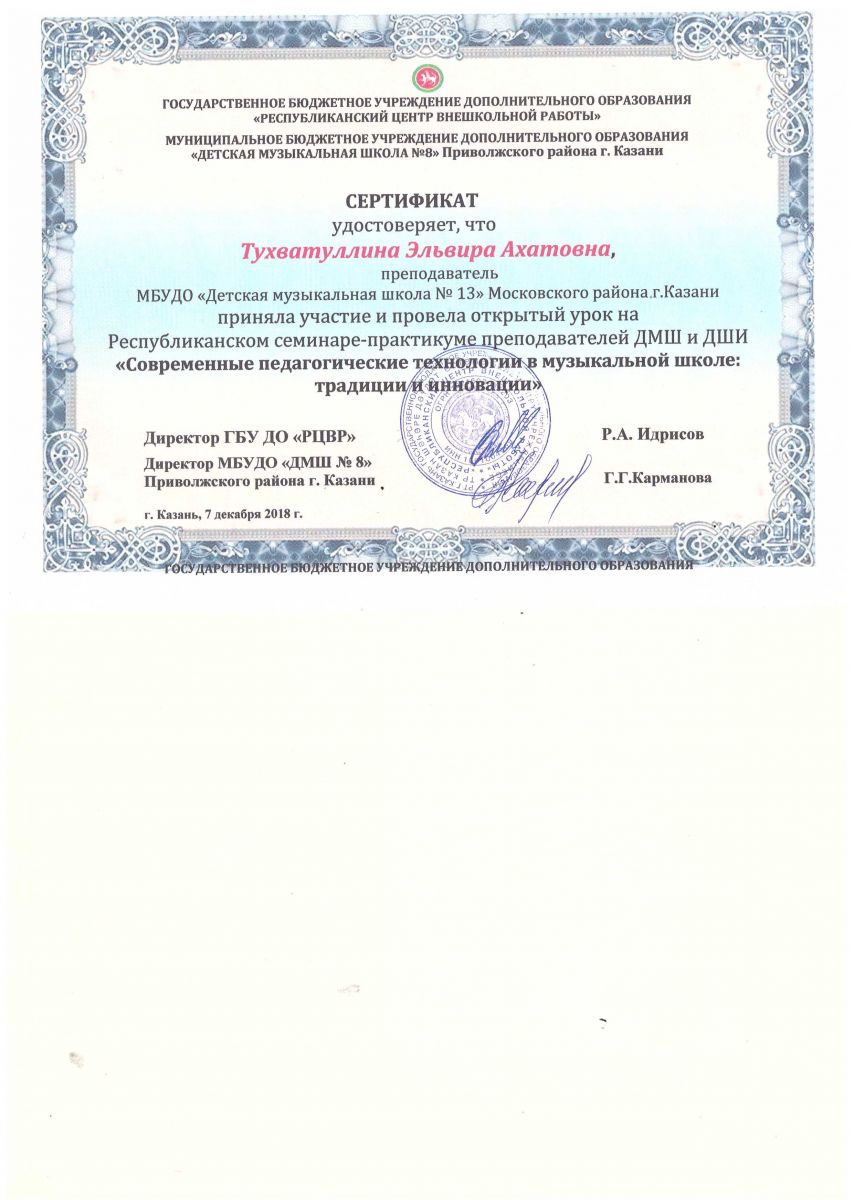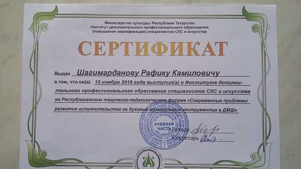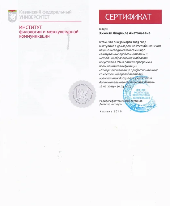 Республиканский научно-практический семинар "Актуальные проблемы теории методики в области искусства РТ" Сертификат Сертификат