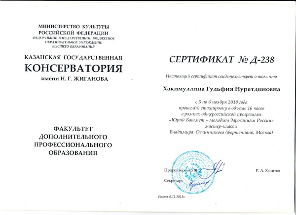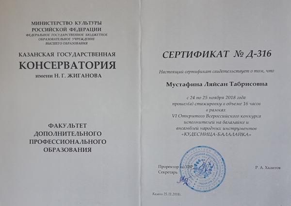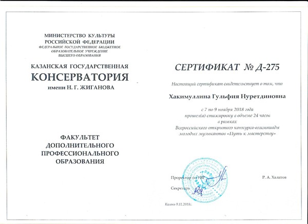 11.2018 Стажировка в рамках Открытого Всероссийского конкурса-олимпиады молодых музыкантов "Путь к мастерству" Сертификат Сертификат