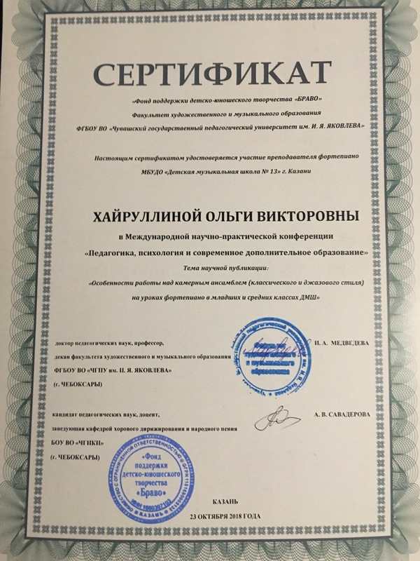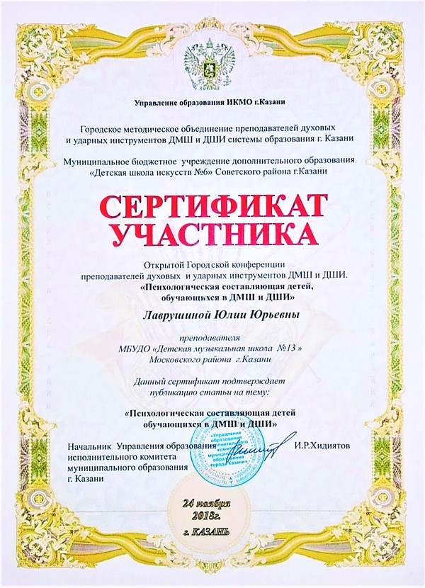 11. 2018 Открытая городская конференция преподавателей духовых и ударных инструментов ДМШ и ДШИ "Психологическая составляющая детей, обучающихся в ДМШ и ДШИ Сертификат