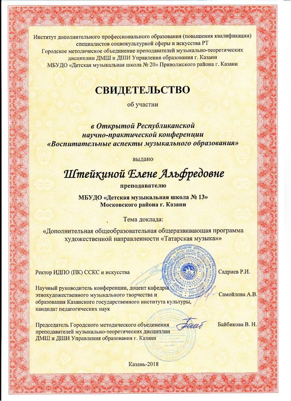 Научно-практическая конференция "Воспитательные аспекты музыкального образования" Свидетельство Свидетельство