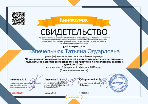 Онлайн-конференция "Формирование творческих способностей у детей: художественное-эстететическое и музыкальное развитие, экспернтео мнение практиков по художественному развитию у детей до 10 лет " Сертификат