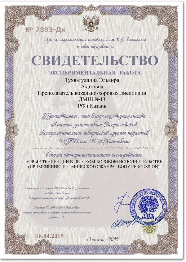Всероссийская экспериментальная группа педагогов ЦПИ им.Ушинского. Тема экспериментального исследования: "Новые тенденции в детском хоровом исполнительстве" Сертификат