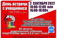 День встречи с учащимися 2 сентября 2022 года с 10.00-12.00 или с 16.00-18.00