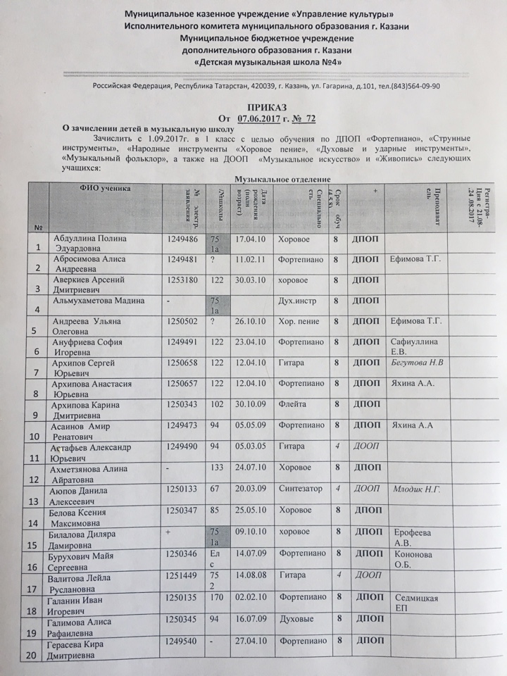 Приказ о зачислении детей в школу на музыкальное и художественное отделение :