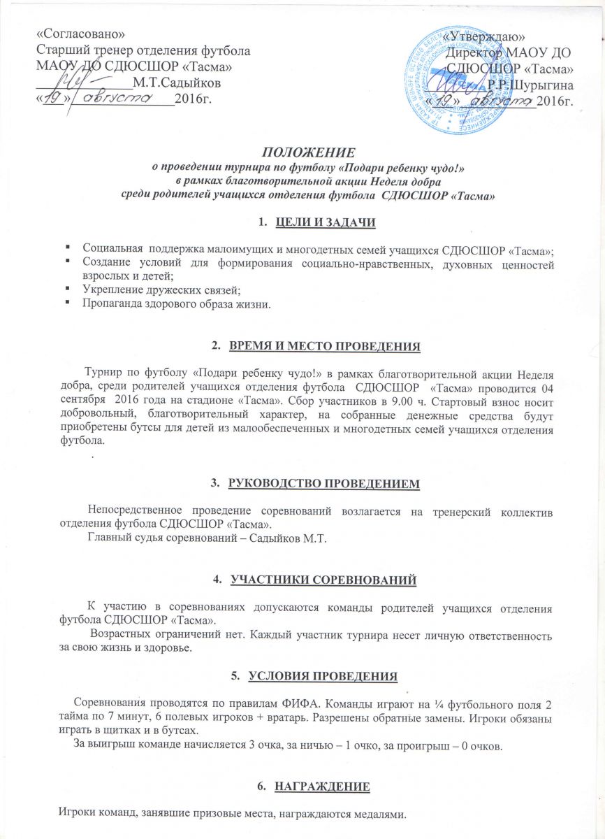 Уважаемые родители и учащиеся МАОУ ДО СДЮСШОР "Тасма"! Информируем Вас о том, что 04.09.2016 в рамках благотворительной акции "Неделя добра" на стадионе "Тасма" пройдет турнир по футболу⚽ среди родителей учащихся отделения футбола СДЮСШОР "Тасма"
