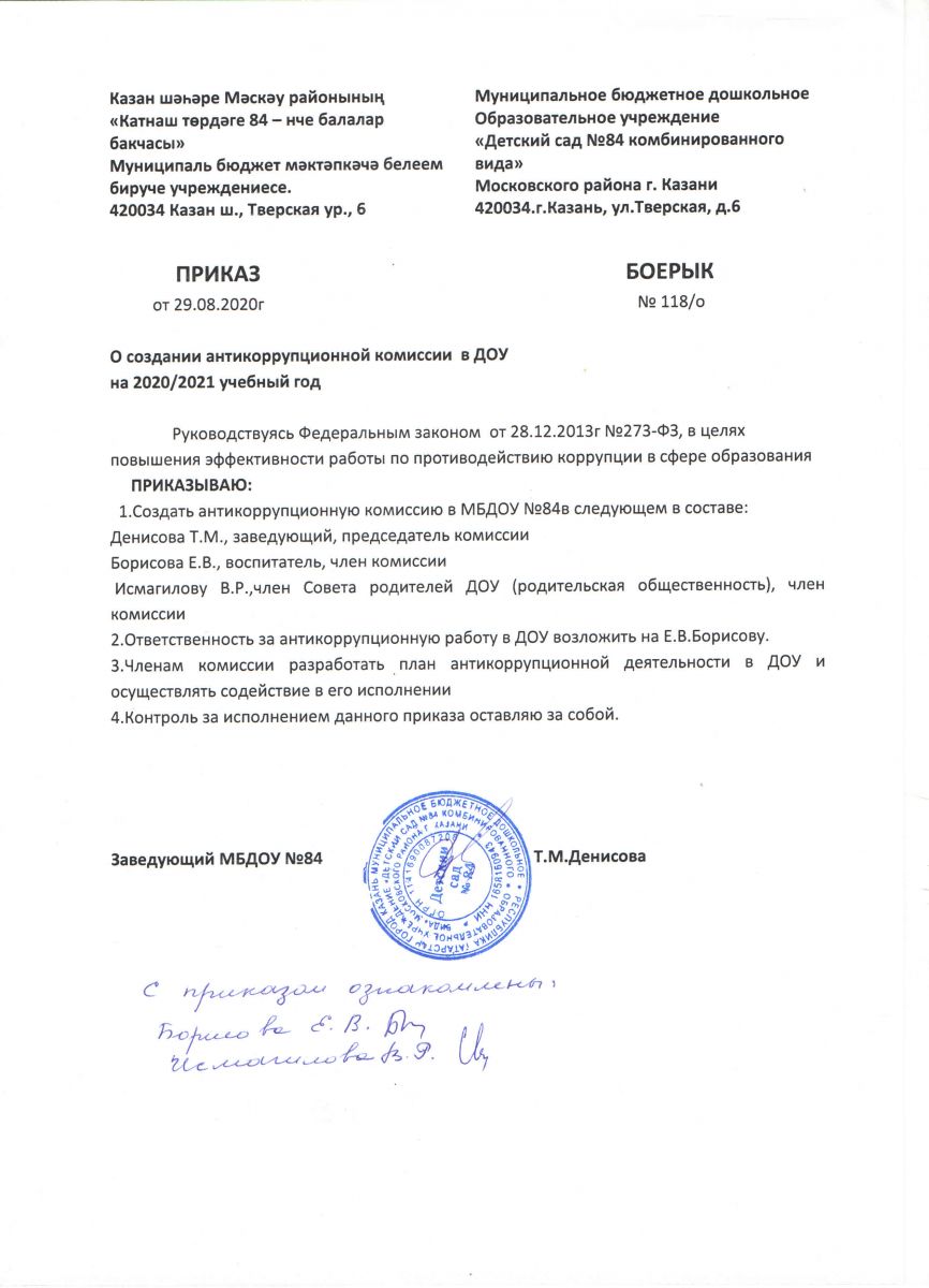 Приказ о создании антикоррупционной комиссии в ДОУ на 2020 - 2021 г