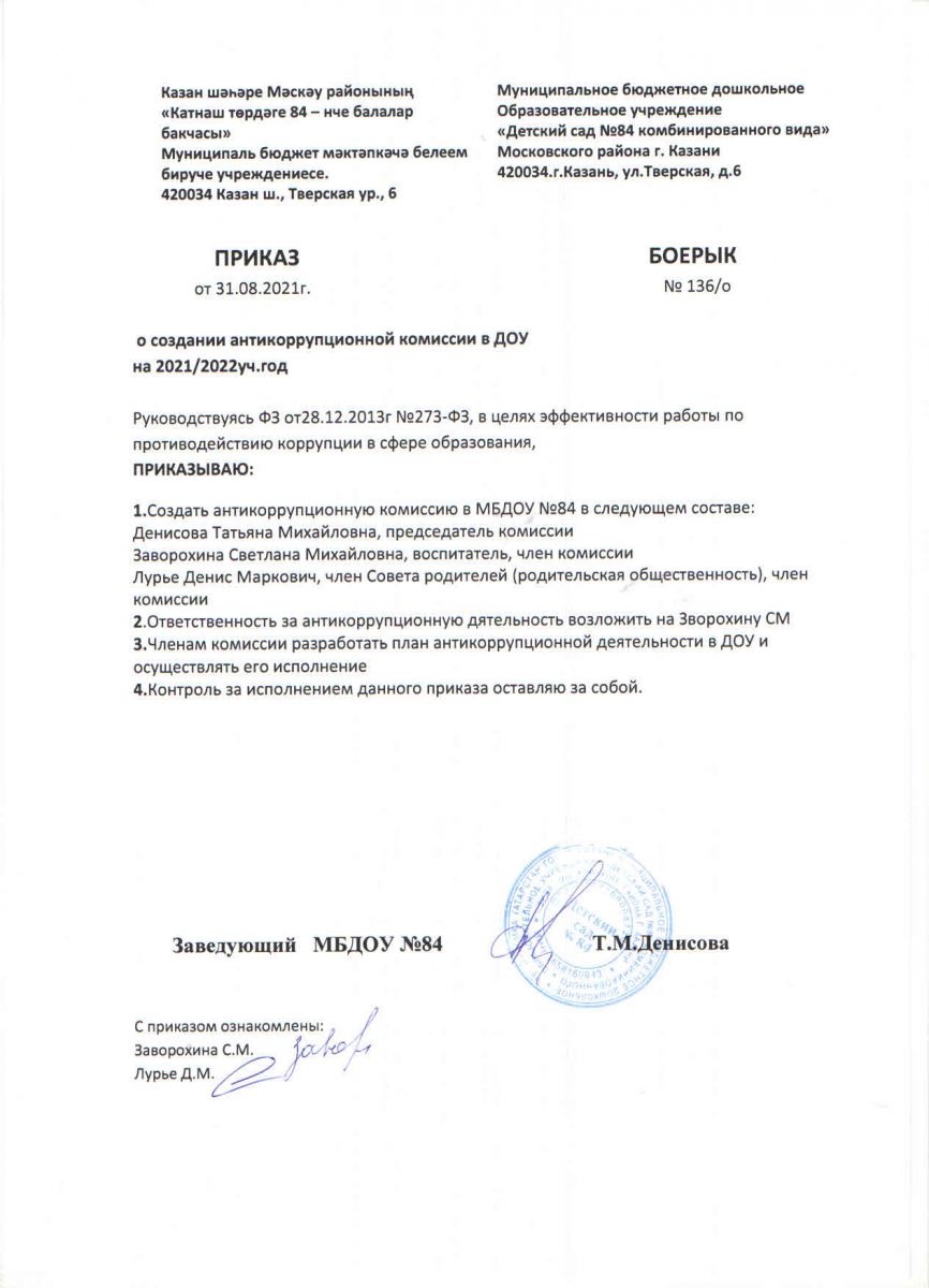 Приказ о создании антикоррупционной комиссии в ДОУ на 2021-2022 г.