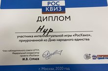18 ноября в КМЦ им.А.Гайдара прошла интеллектуальная игра "РосКвиз", приуроченная ко Дню народного единства! Наша команда ДОО "Нур" заняла 5 место среди 15 команд из ДОО "Дети Казани"! Поздравляем!