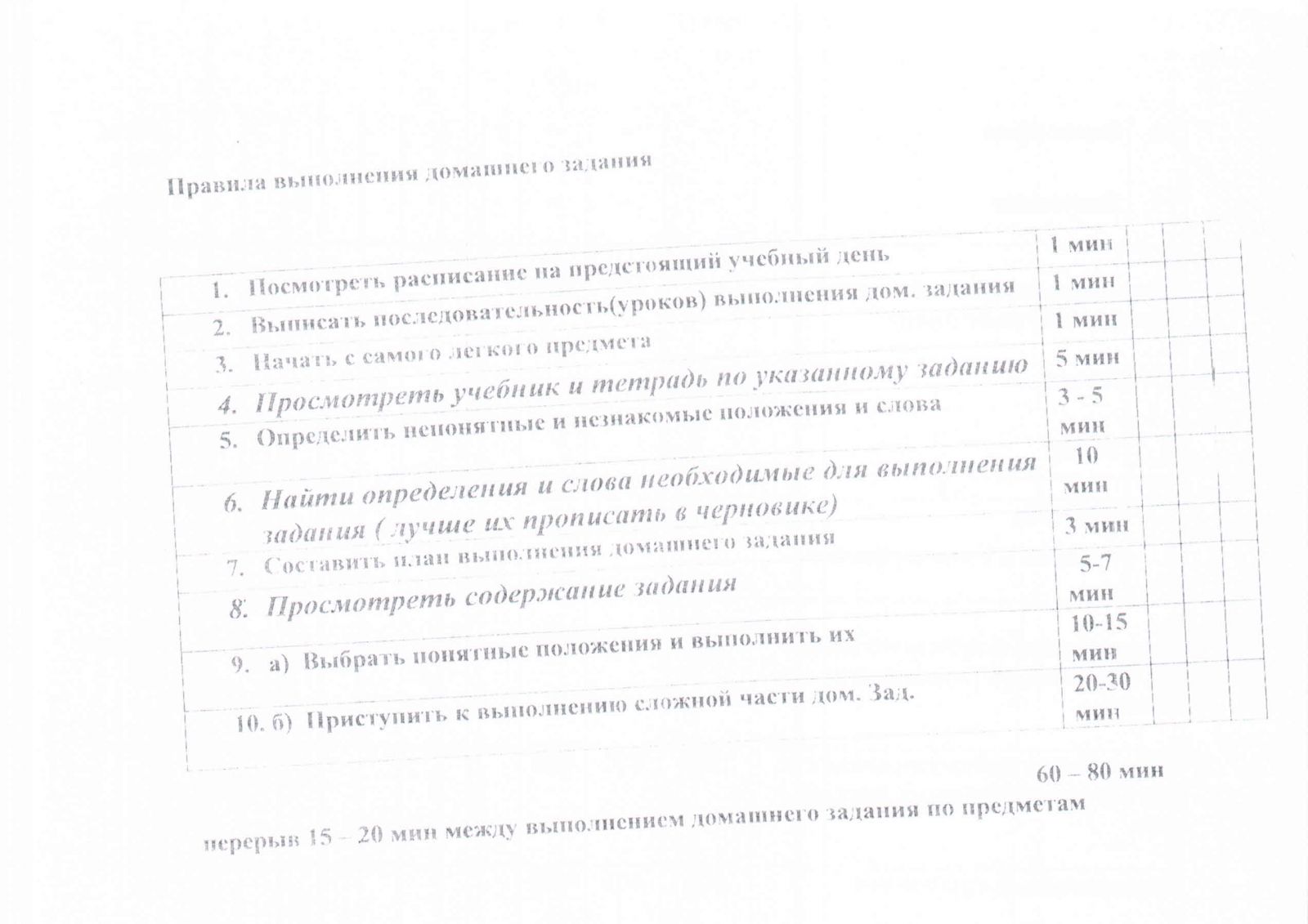 Домашнее задание по выбранным предметам выполнили за очень короткий интервал времени от 10 до 15 мин. Следовательно, у гимназисток остается достаточный резерв времени, который можно использовать для формирования и тренировки умений предъявлять свои знания, развивая речь, пересказывая содержание домашнего задания.