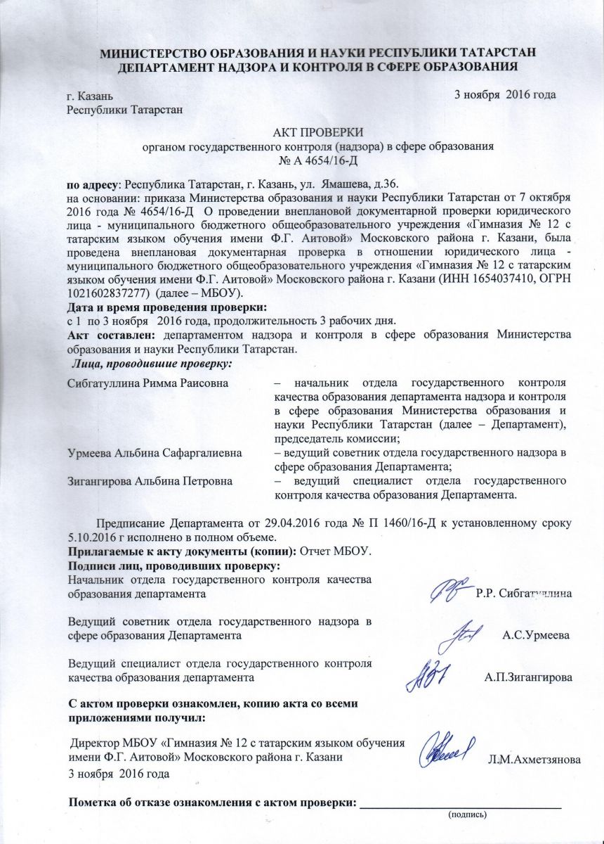 Предписание Департамента надзора и контроля в сфере образования Министерства образования и науки Республики Татарстан от 29 апреля 2016г. - выполнено.