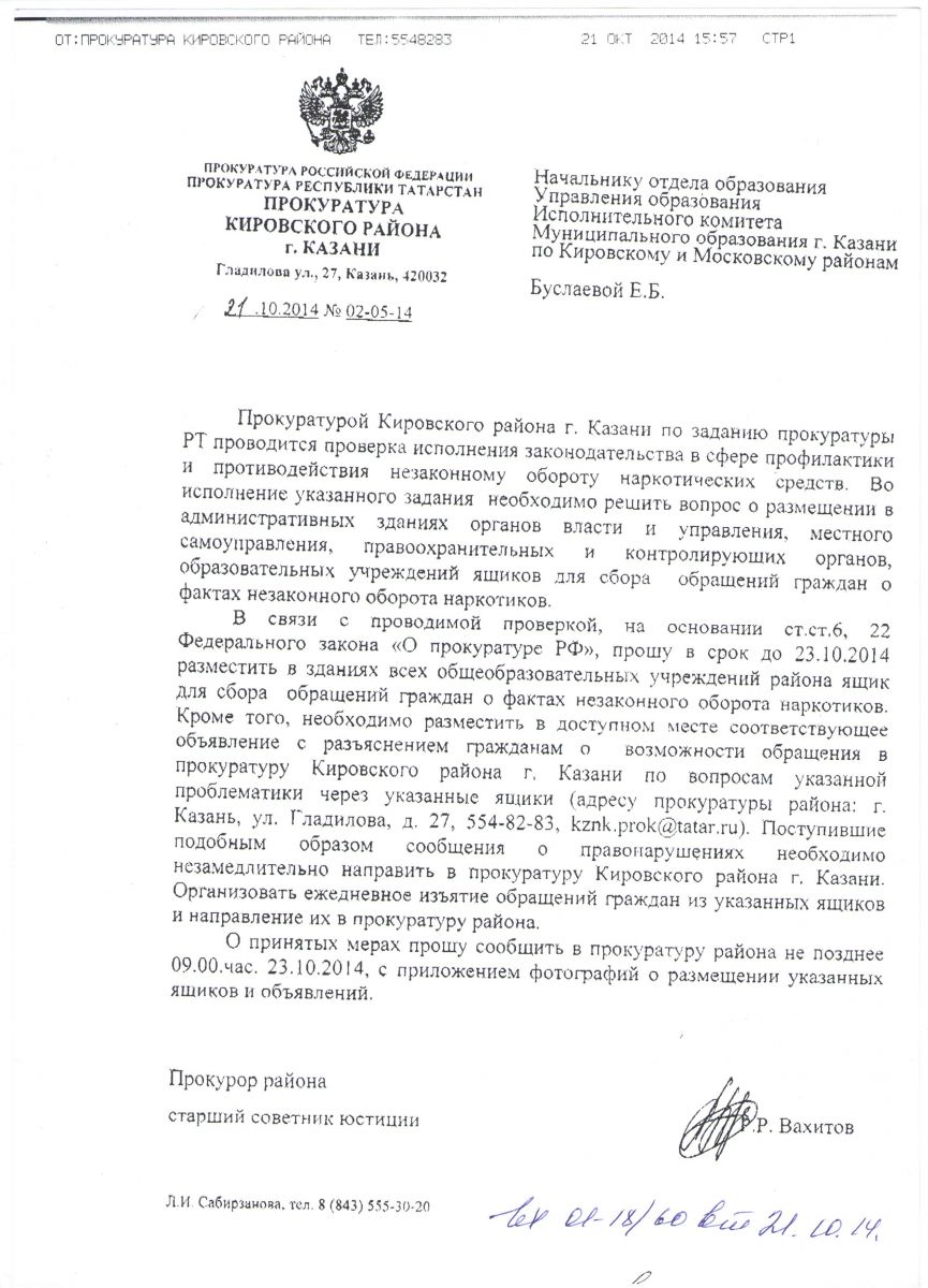 Письмо прокуратуры Кировского района № 02-05-15 от 21.10.2014"О противодействии незаконному обороту наркотических средств"