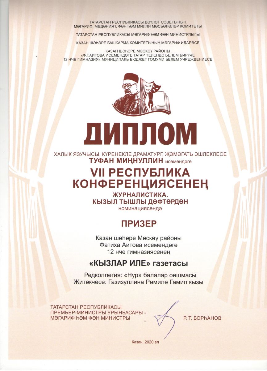 - Республиканская конференция имени Туфана Миннуллина в номинации "Детская пресса-2020"/ редакция газеты "Кызлар иле" - Призёр