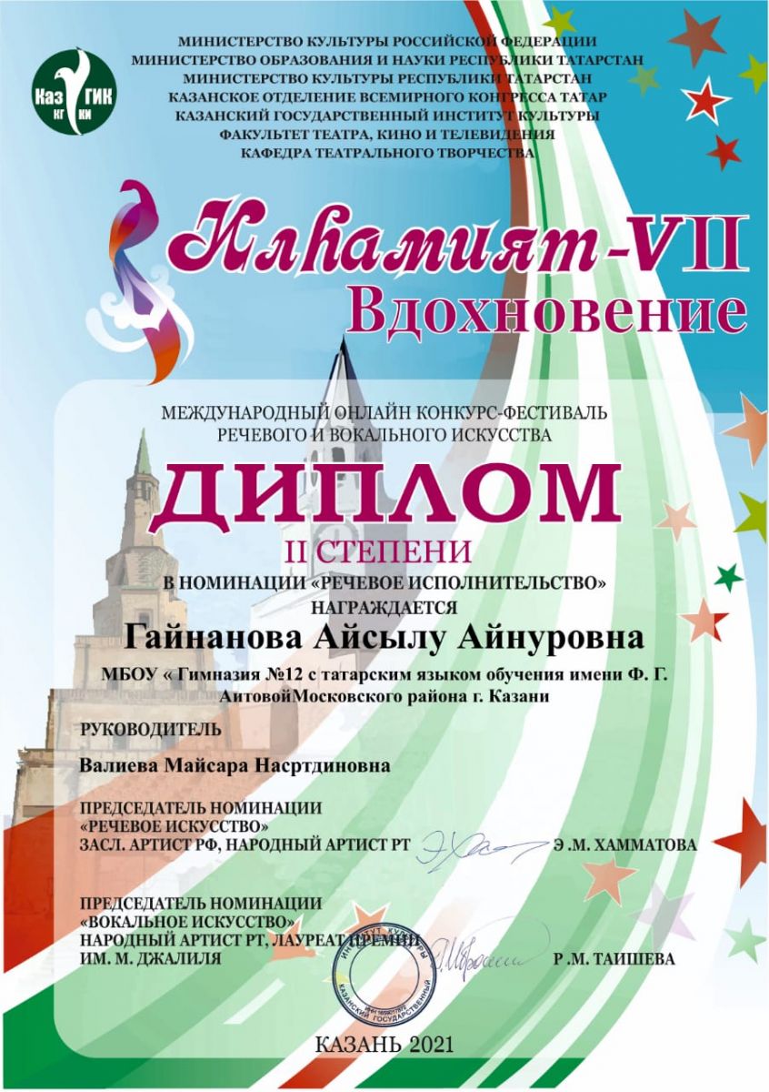 - "Илһамият - 2022"/ Номинация "Речевое исполнительство"/ Гайнанова Айсылу - Дипломант II степени
