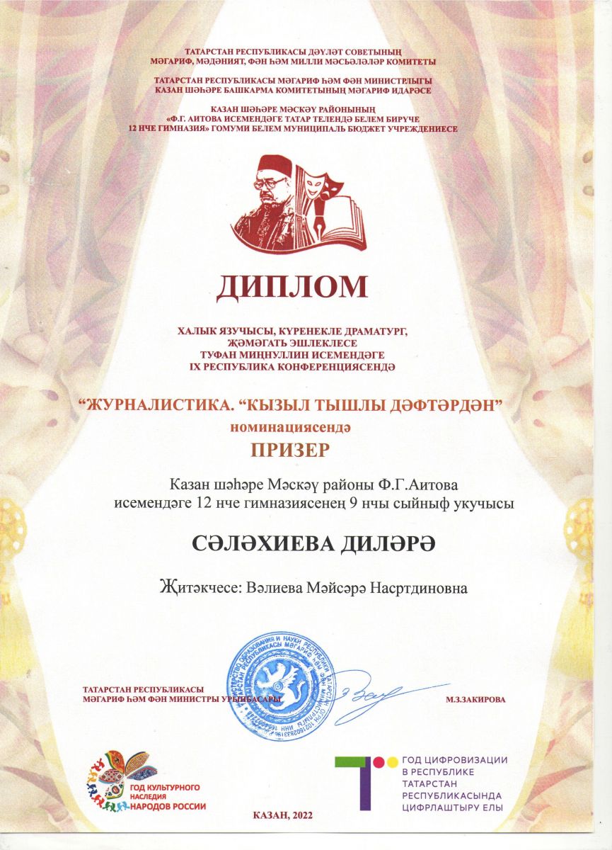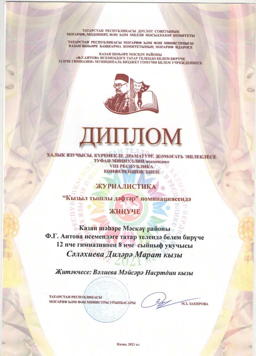 - Республиканская НПК имени Т.А.Миннуллина, 2021/ Номинация "Журналистика"/ Салахиева Диляра - Победитель