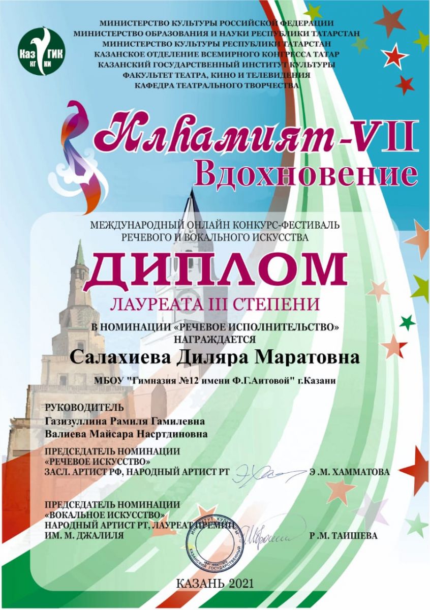 - "Илһамият - 2022"/ Номинация "Речевое исполнительство"/ Салахиева Диляра - Лауреат III степени
