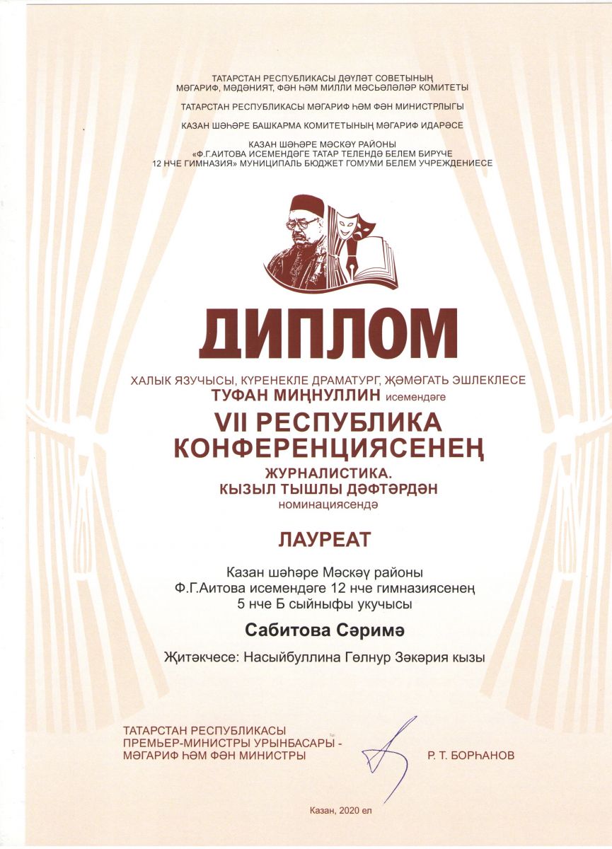 - Республиканская конференция имени Туфана Миннуллина в номинации "Журналистика-2020"/ Сабитова Сарима - Дипломант