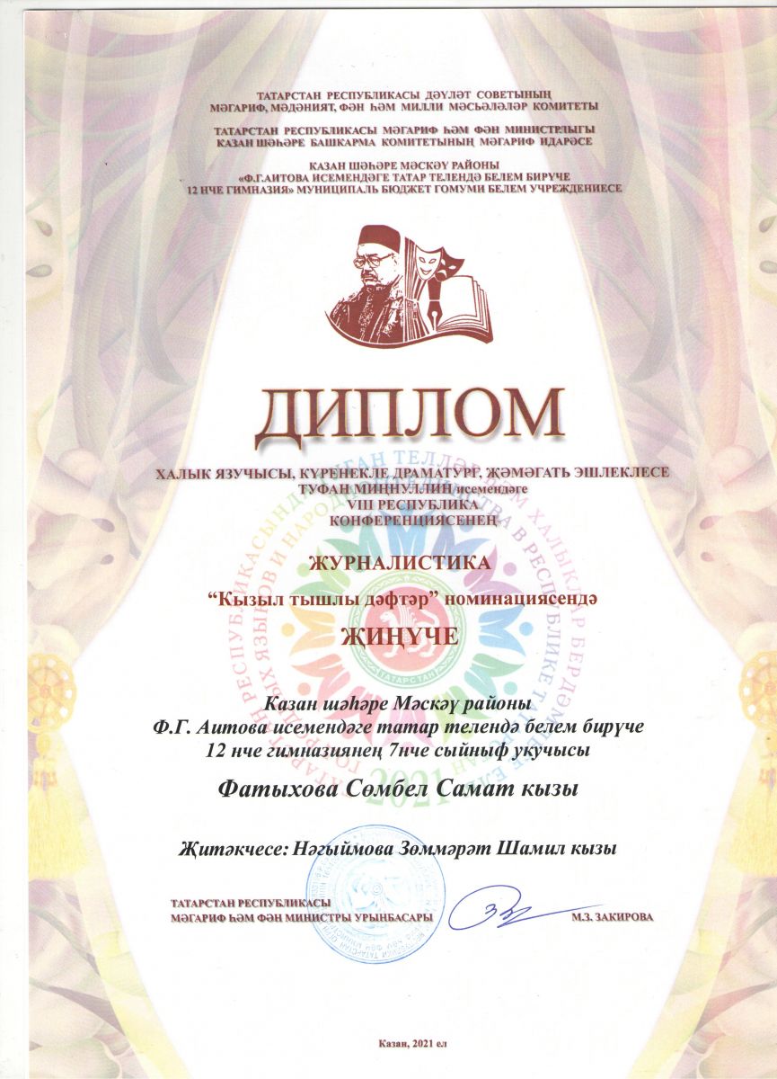 - Республиканская НПК имени Т.А.Миннуллина, 2021/ Номинация "Журналистика"/ Фатыхова Сюмбель - Победитель