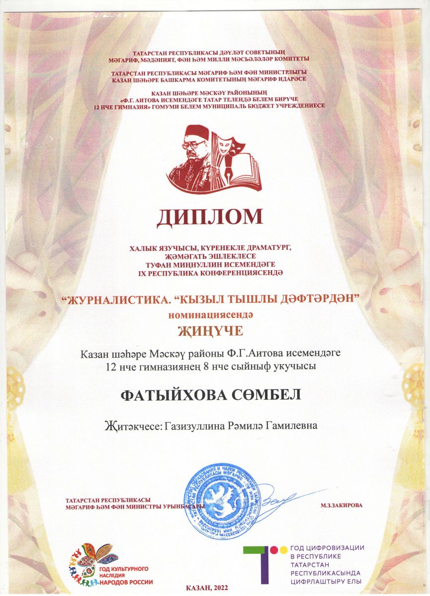 - Всероссийский конкурс юных писателей "Илһам", 2022/ Номинация "Журналистика"/ Фатыхова Сюмбель - Лауреат