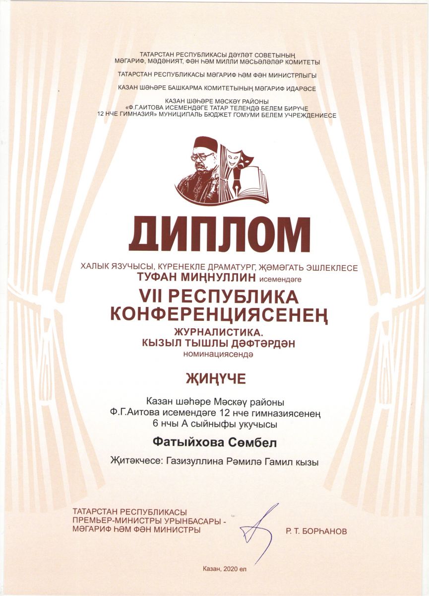 - Республиканская конференция имени Туфана Миннуллина в номинации "Журналистика-2020"/ Фатыхова Сюмбель - Победитель